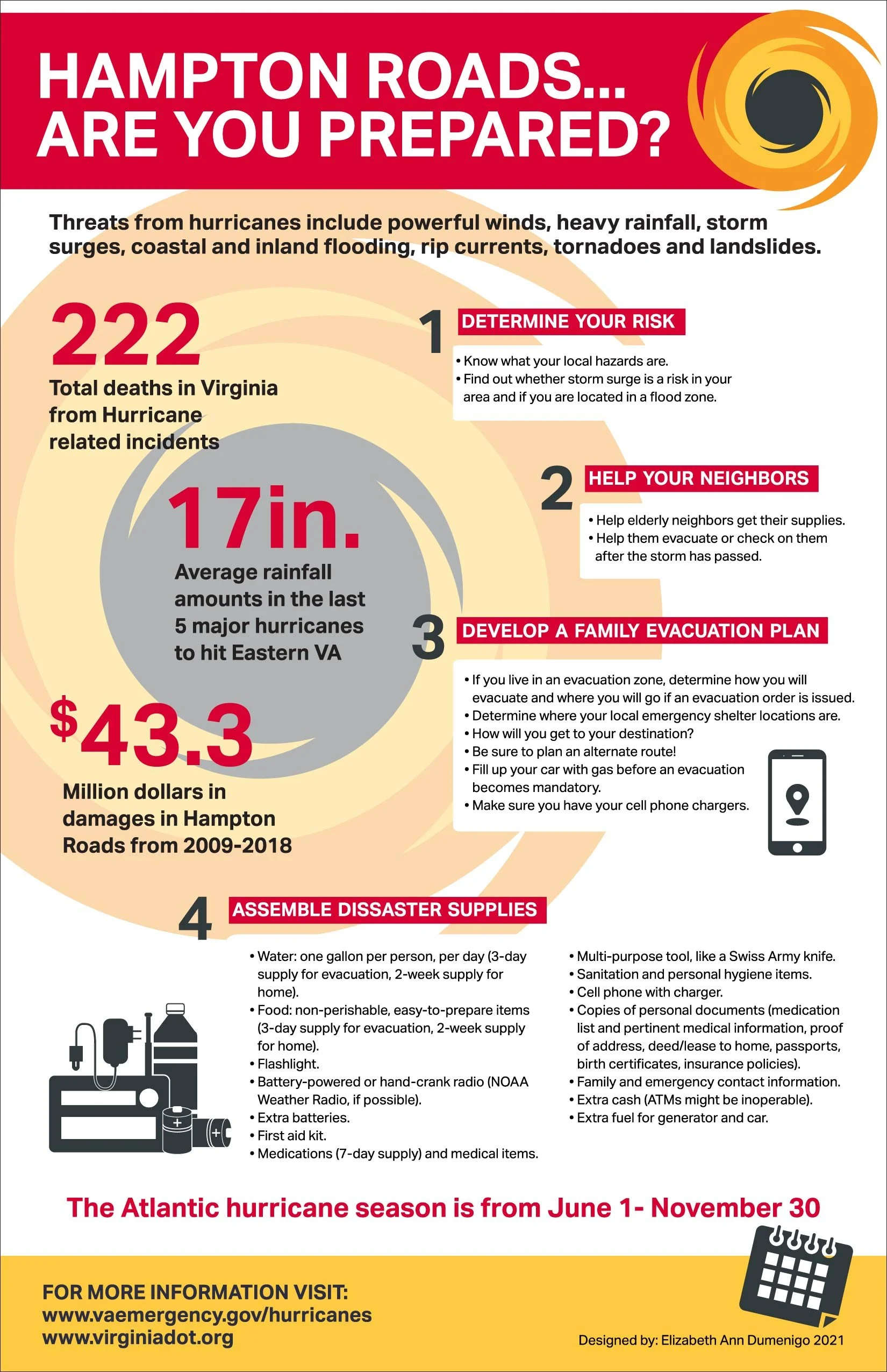 The limited color palette allows for the focus areas, in red, to be the forefront of the information. The red, yellow, and orange colors stimulate a sense of importance and urgency of the information. The Doppler image of the hurricane in the background, with its circular motion, directs the eye to follow along with the four main points of the poster. Simple, engaging visuals were used to communicate information quickly and clearly.